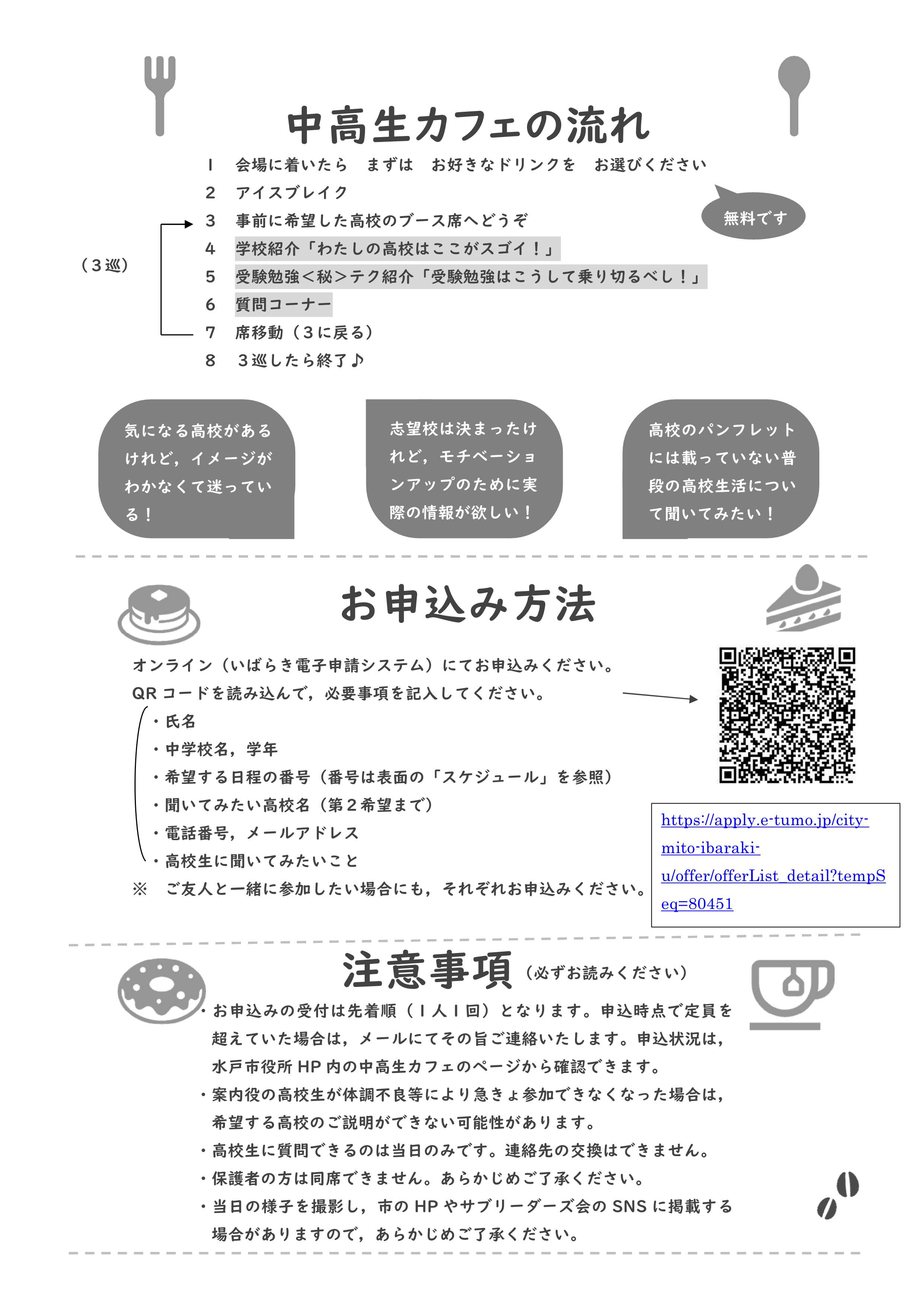 中高生カフェは,現役の高校生である水戸市サブリーダーズ会(高校生会)の会員が,受験を控えた中学生向けにそれぞれの高校の魅力を紹介する受験応援企画です。