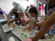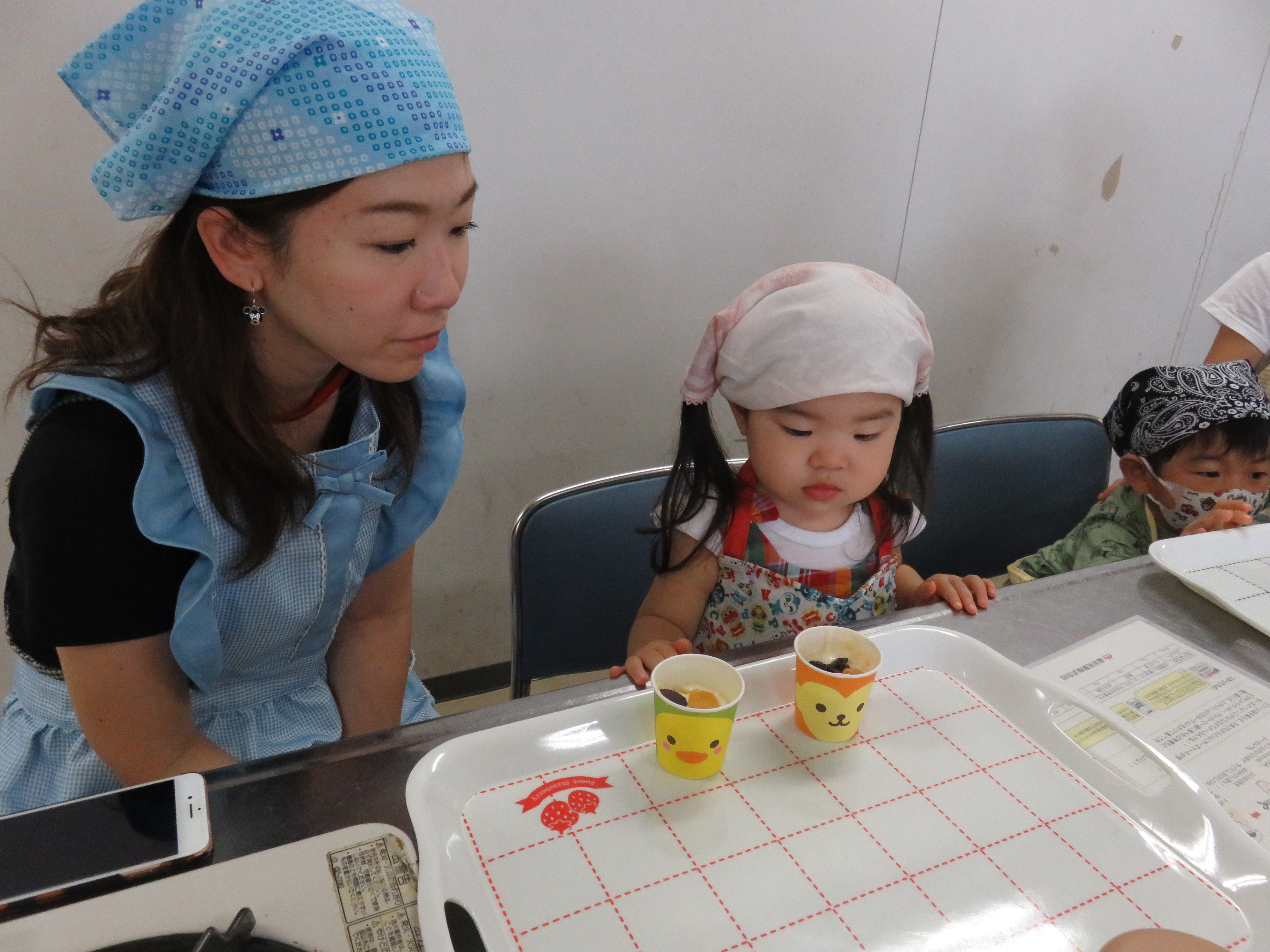 親子一緒に、2歳児でも参加できるアイデア料理「プチ・チーズデザート 」「お絵かきビスケット」作りを体験しました。子どもたちには、みんなで一緒に作って食べることで、作る楽しさや、美味しさなど、食に興味関心をもってもらえます。保護者には、食の新しい知識と子どもがお手伝いが出来ることに気づき、毎日の食生活がより楽しいものになると思います。