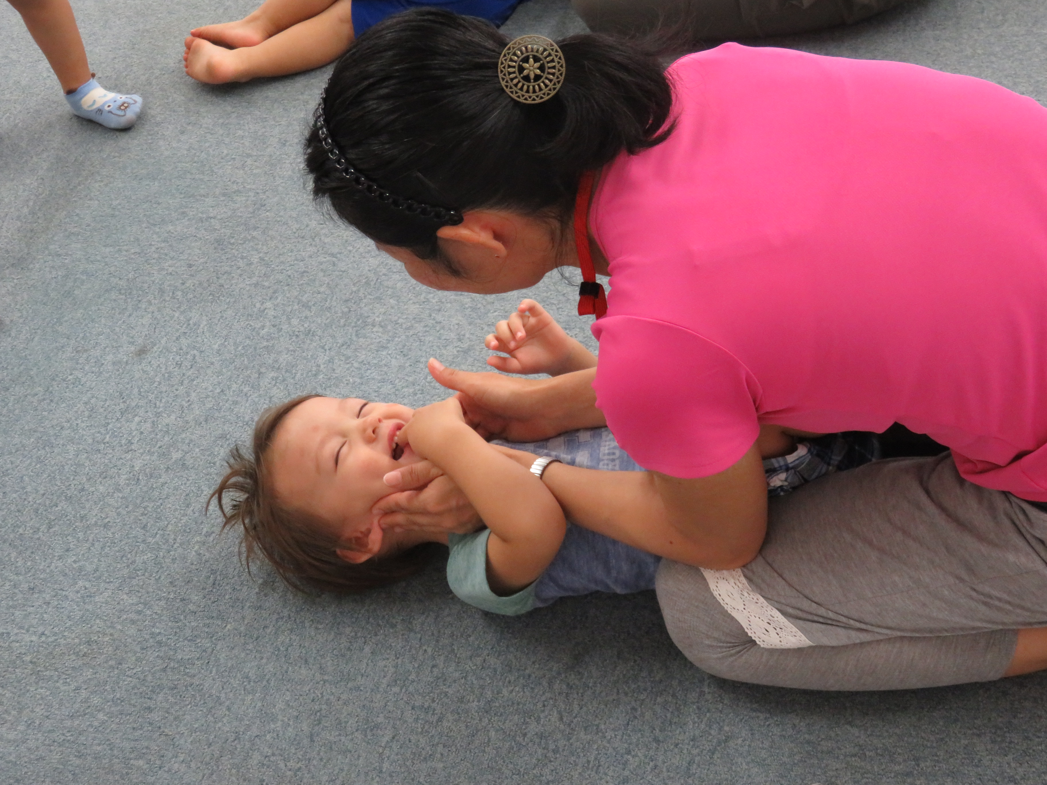 ベビーマッサージ協会の渡邊江津子先生御指導のもと『ベビーマッサージ』で子どもにママが全身マッサージをします。気持ちよくてうとうとする子どもたち。体と心が温まったら、キッズヨガインストラクターの子安美穂先生の『親子ヨガ』です。神秘的な鈴の音が静寂な空間を作り呼吸法の練習をしました。