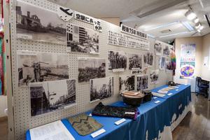 戦後75年の特別展示として、戦時中、兵士・市民がどのような暮らしをしていたのか、また一度焼け野原となった水戸がどういった復興を遂げたのか、写真資料のほか、千人針や防空頭巾・飯盒など、当時の人々が実際に使用していた道具を展示しました。あわせて、平和に関する市の取組を写真で紹介しました。