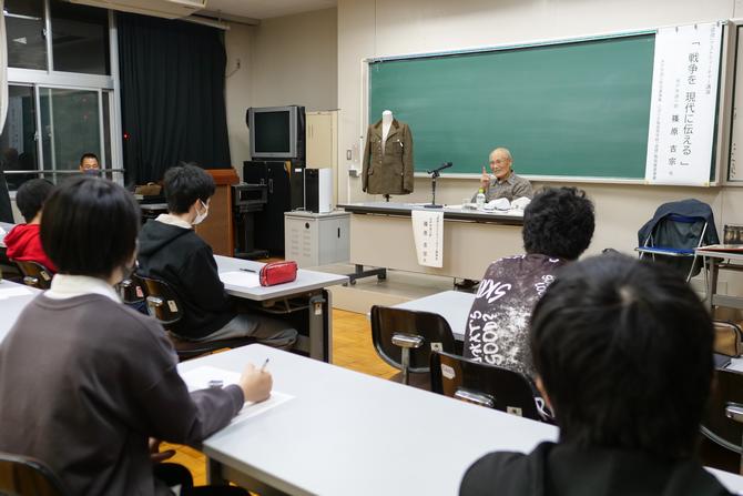 講演では、当時の写真・資料などを用いながら、予科練習への憧れと入隊後の現実、シベリアでのつらい抑留生活や現地の人とのつかの間の交流など、安心して勉強ができる今の生活がどれだけ幸せなことなのか、平和の大切さについて、お話をされました。