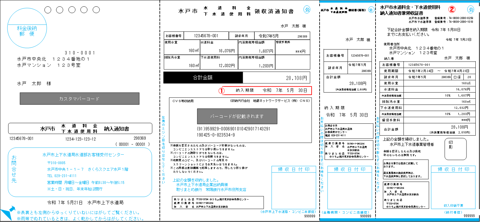 また、これまで納入通知書は請求月の20日頃に郵送していましたが、令和8年5月請求分より検針したその場で納入通知書を発行し、「使用水量のお知らせ(検針票)」と一緒に封筒に入れて郵便受け等に投函する「現地投函」を開始します。