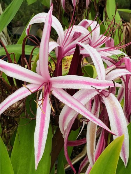 今から30年以上前、福岡市植物園を訪問した時、分けていただいた思い出の株Crinum amabileです。ヒガンバナ科ハマオモト属 原産地はスマトラなどアジアの熱帯地域。草丈1.5mほどの大型。