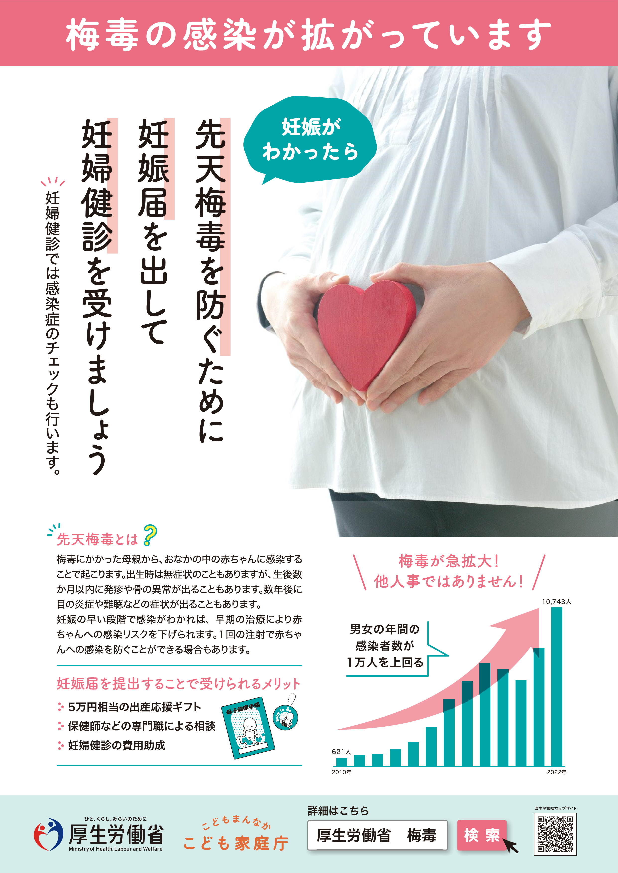 令和6年は、男女ともに20代の感染者が最も多くなっています。妊娠している方が梅毒にかかっていると、死産や早産になったり、胎盤を介して胎児にも感染し、先天梅毒により生まれてくる子どもの神経や骨などに異常をきたすことがあります。