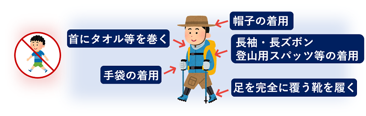 野外作業や農作業、レジャーなどで、ダニの生息場所となる山や草むらなどに立ち入るときは、できるだけ肌を露出しないようにすることが大切です。