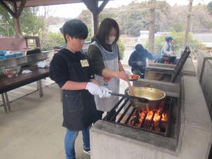 食べ終わったら,使用した調理器具や食器を洗ったり,かまどを掃除して終了です
